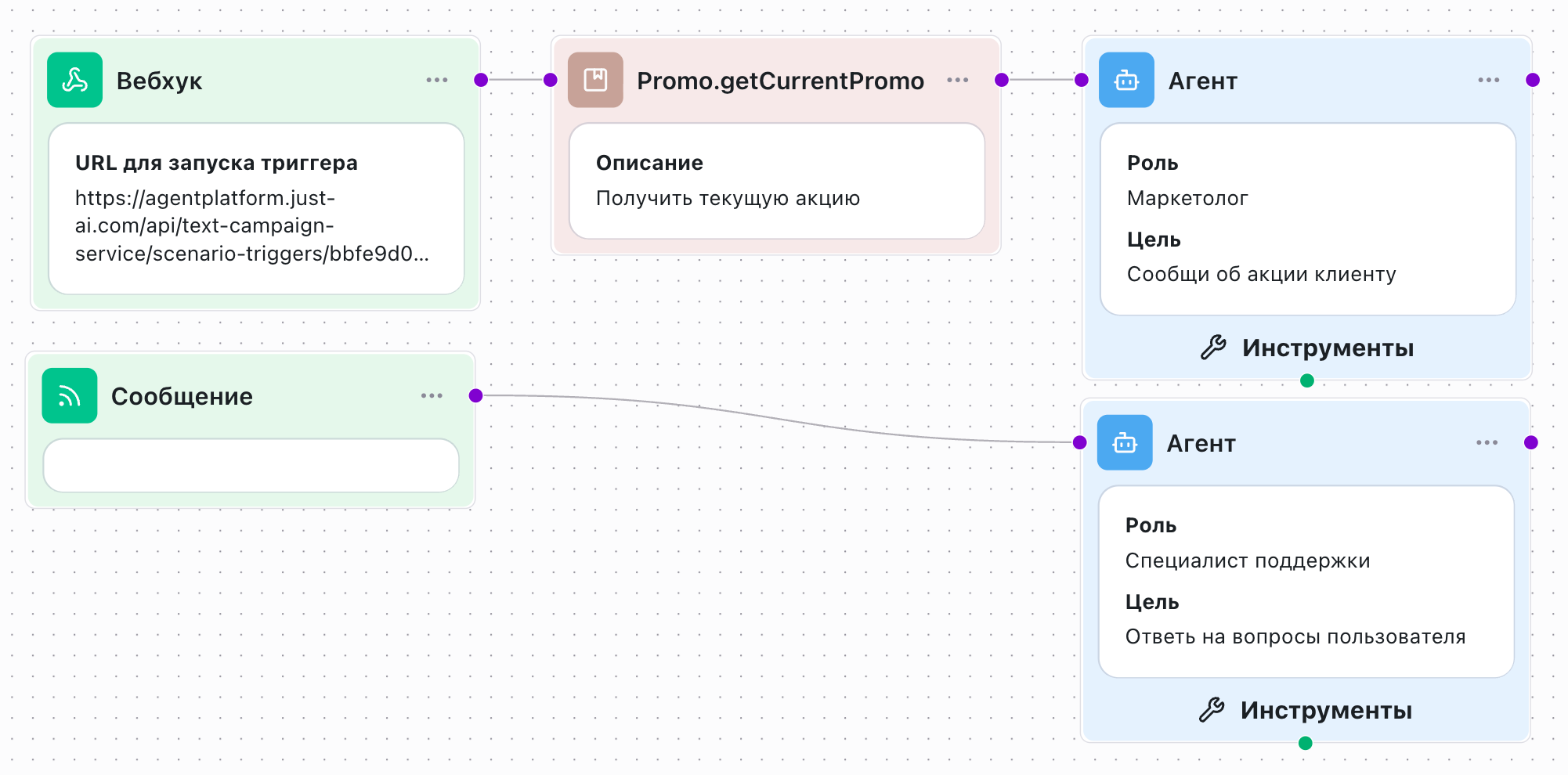 Чтобы пользователь мог задать вопросы по акции, добавьте второго агента. Он будет реагировать на сообщения: