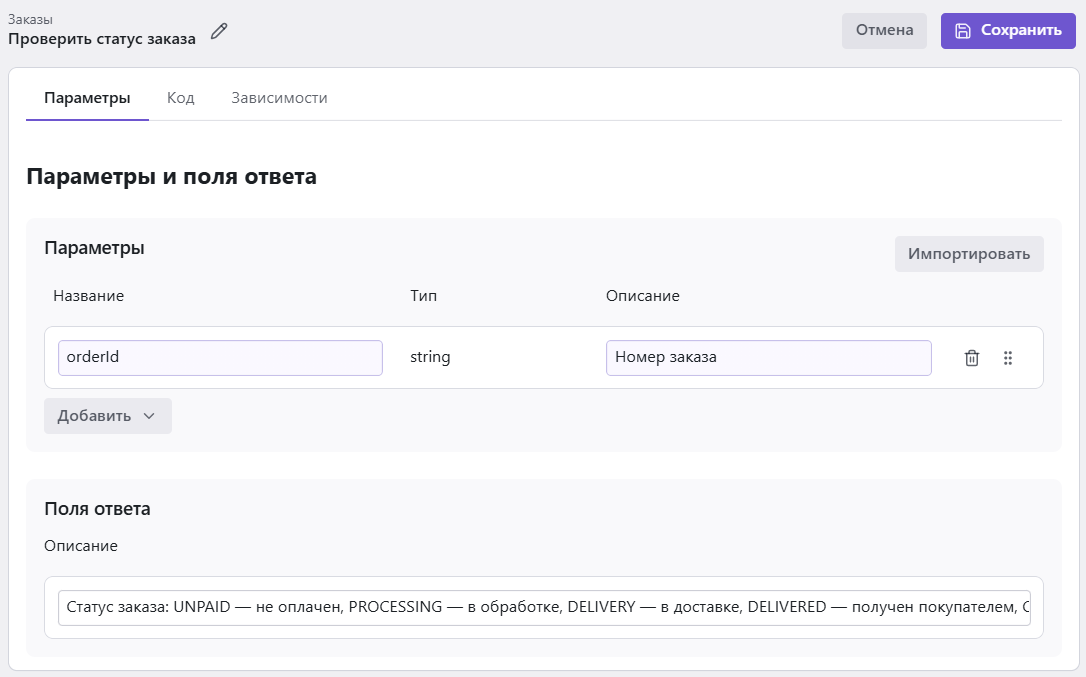 - Описание — особенно важно, если функция будет использоваться в качестве инструмента для AI-агента. Помогает агенту понять, для чего следует вызывать эту функцию.