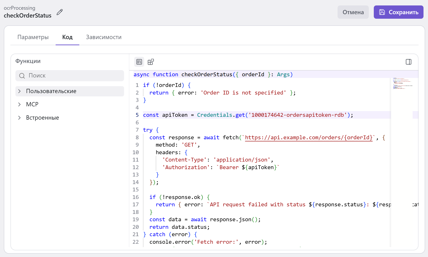 На вкладке Код напишите тело функции на JavaScript. Встроенный редактор поддерживает подсветку синтаксиса, автодополнение, подсказки при наведении на функцию и отображение ошибок.