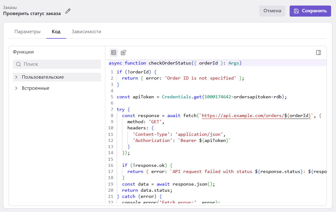 async). Это позволяет использовать в их кодеawaitдля асинхронных операций, например для выполнения HTTP-запросов с помощьюfetch(). - Не вставляйте учетные данные и другие секреты в код функции.