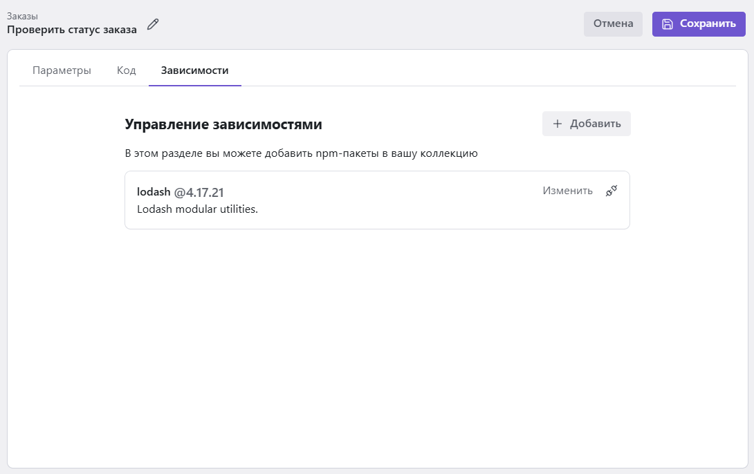 Если для работы вашего кода требуются внешние npm-пакеты (например, axios или lodash), добавьте их на вкладке Зависимости.