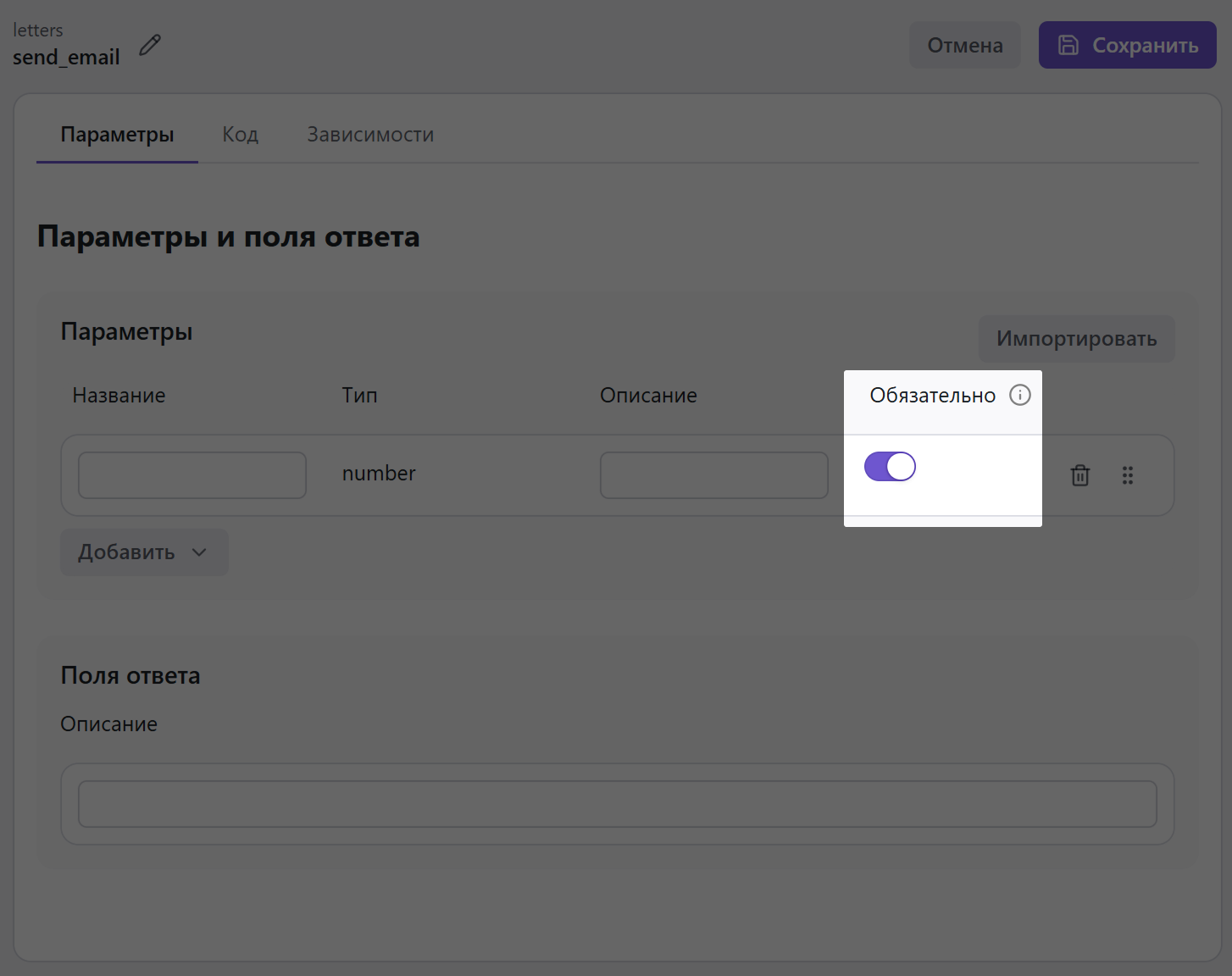 - Удобная настройка функций: выбирайте способ заполнения параметров (поле, JSON или LLM) в один клик. Подробнее