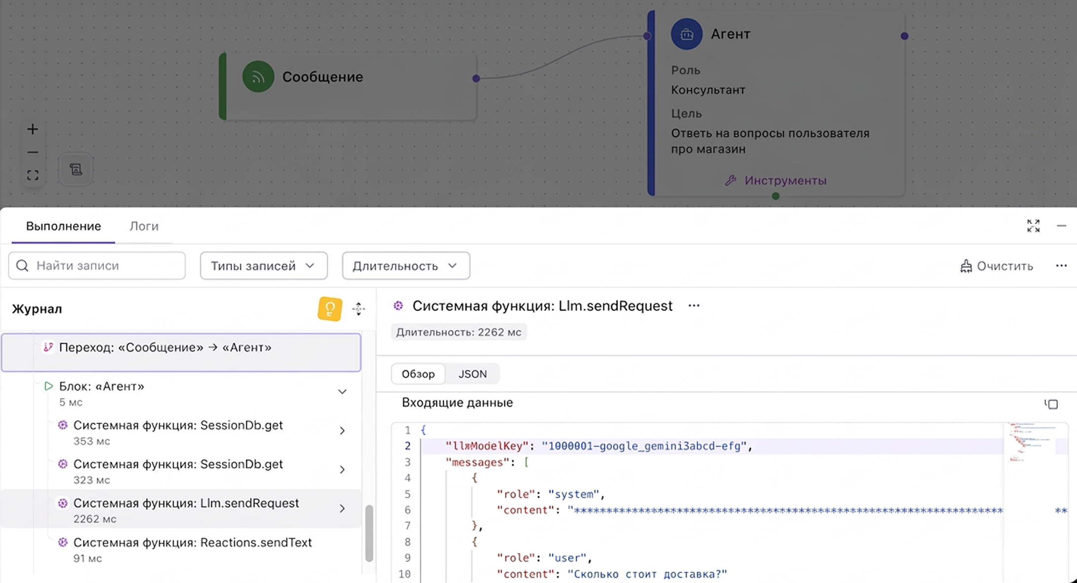 - Панель выполнения процесса: отслеживайте прохождение блоков, анализируйте данные на каждом шаге и находите ошибки прямо на холсте. Подробнее